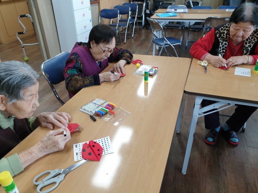 미술치료 시간에 색종이를 이용하여 무당벌레를