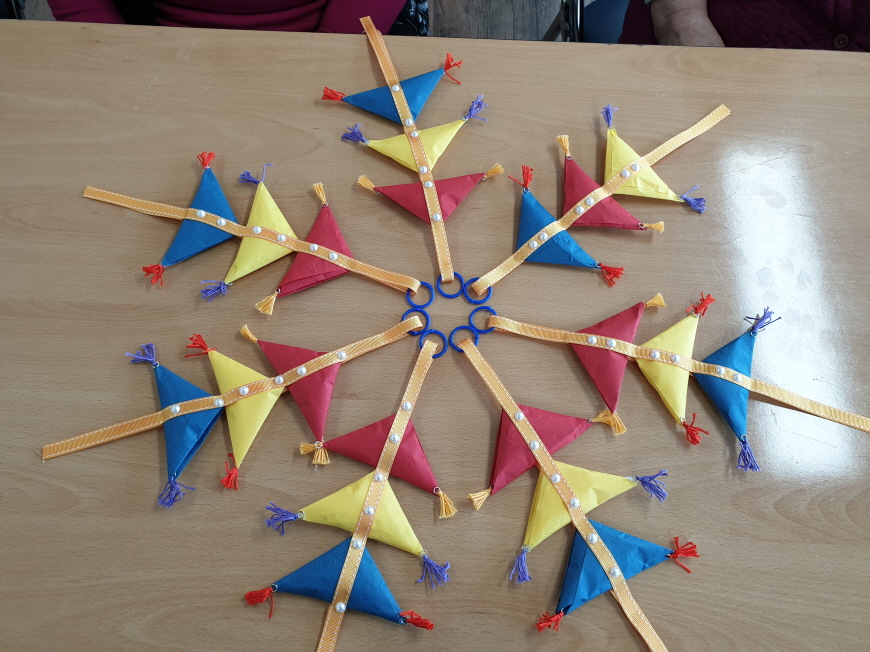 빨강, 파랑, 노랑색 한지를 이용하여 노리개를 만들었습니당``