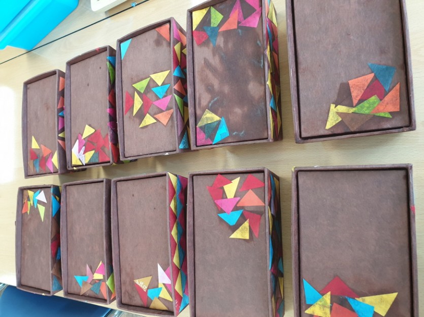 한지공예시간에 찻잔 마감재 칠과 다용도상자에 다양한 색의 한지를 이용하여